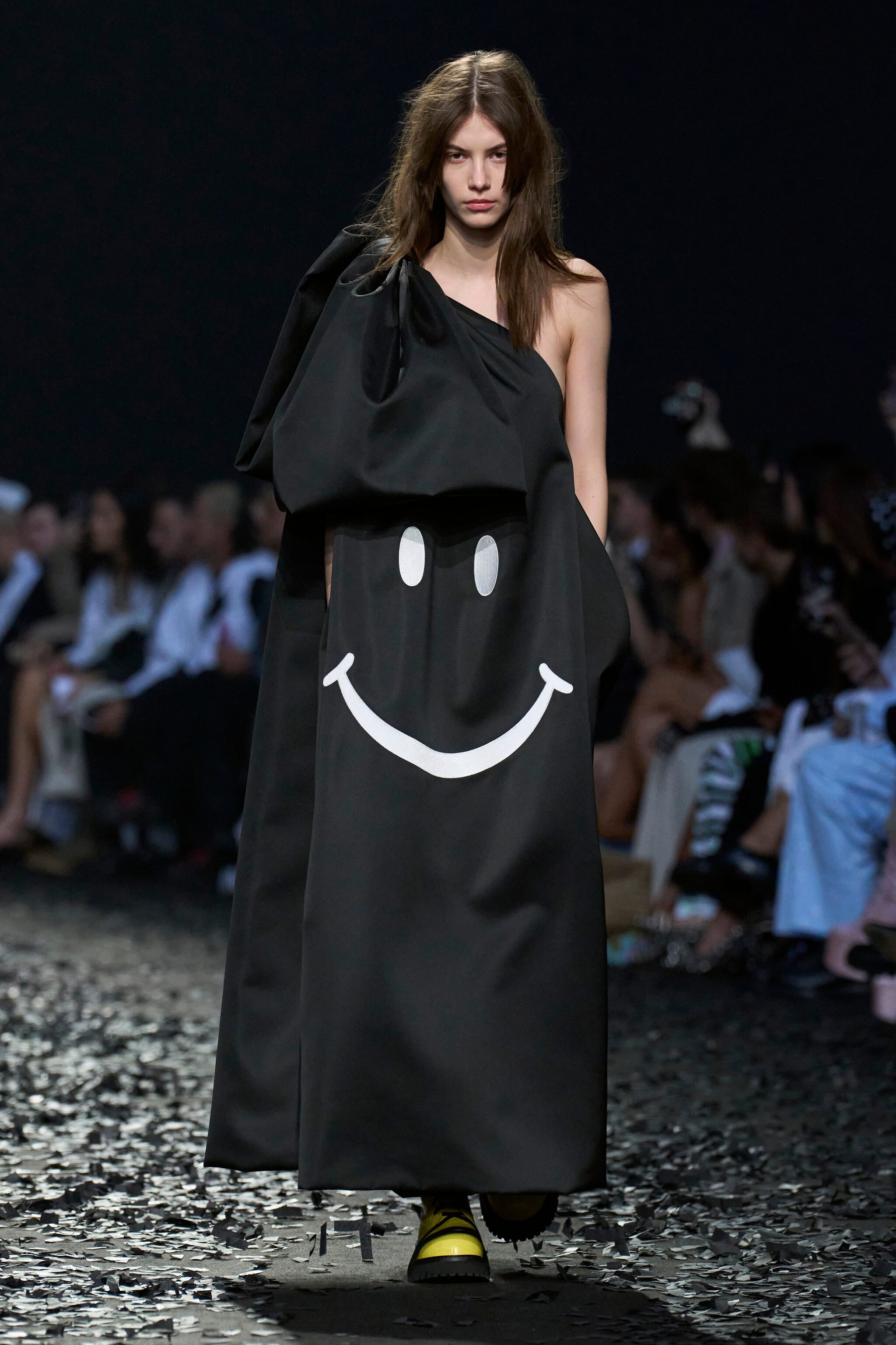 Cappotti sartoriali con cuciture a vista, abiti con spalline balloon, voluminosi piumini con stampe floreali e abiti a maxi shirt sfilano alla Milano Fashion Week sulla passerella Autunno/Inverno 2025-2026 di Moschino