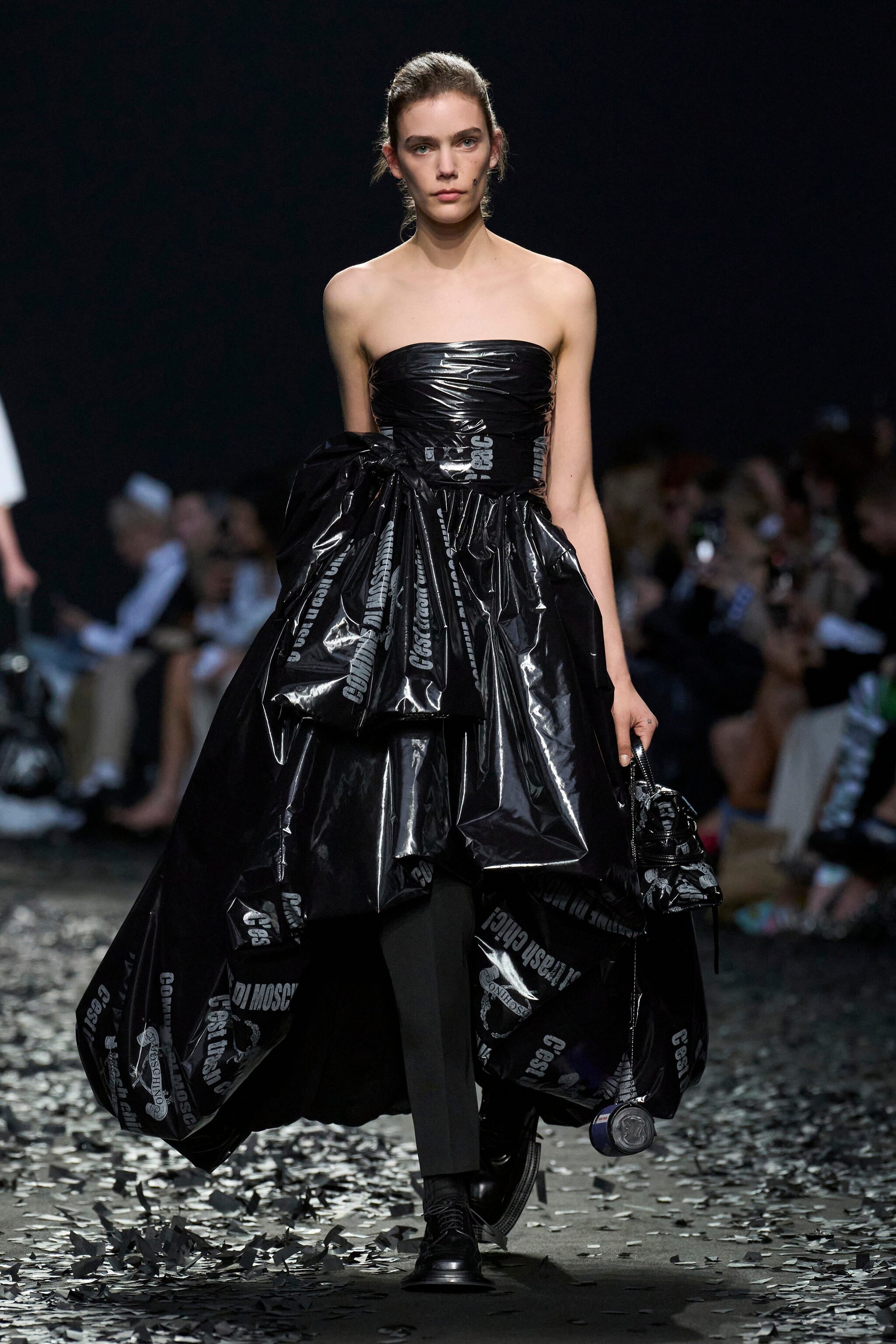 Cappotti sartoriali con cuciture a vista, abiti con spalline balloon, voluminosi piumini con stampe floreali e abiti a maxi shirt sfilano alla Milano Fashion Week sulla passerella Autunno/Inverno 2025-2026 di Moschino
