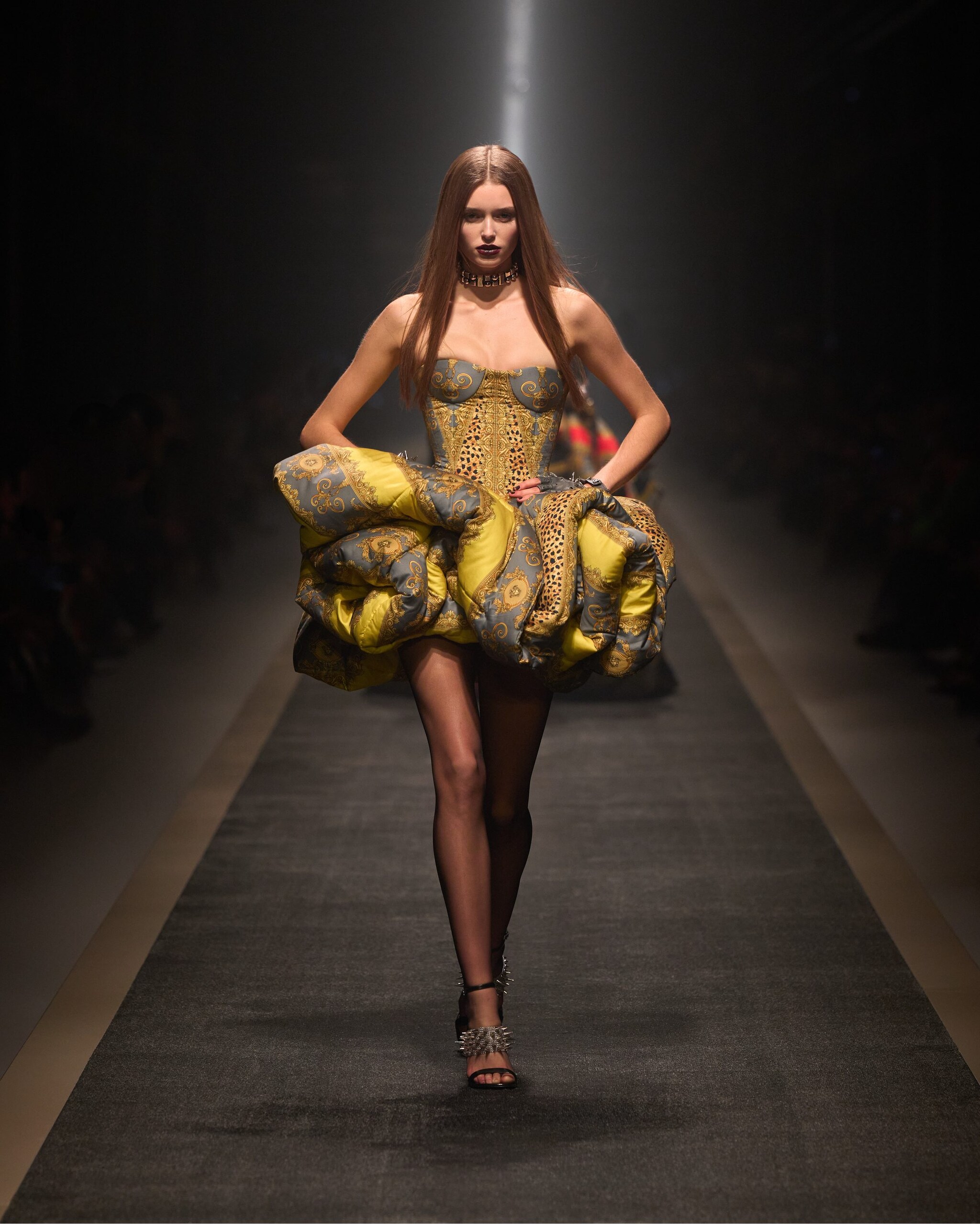 Abiti con gonne trapunta dalle iconiche stampe, mini dress che sembrano realizzati con lembi di tessuto e gonne a ruota dalle linee sinuose sfilano alla Milano Fashion Week sulla passerella Autunno/Inverno 2025-2026 di Versace