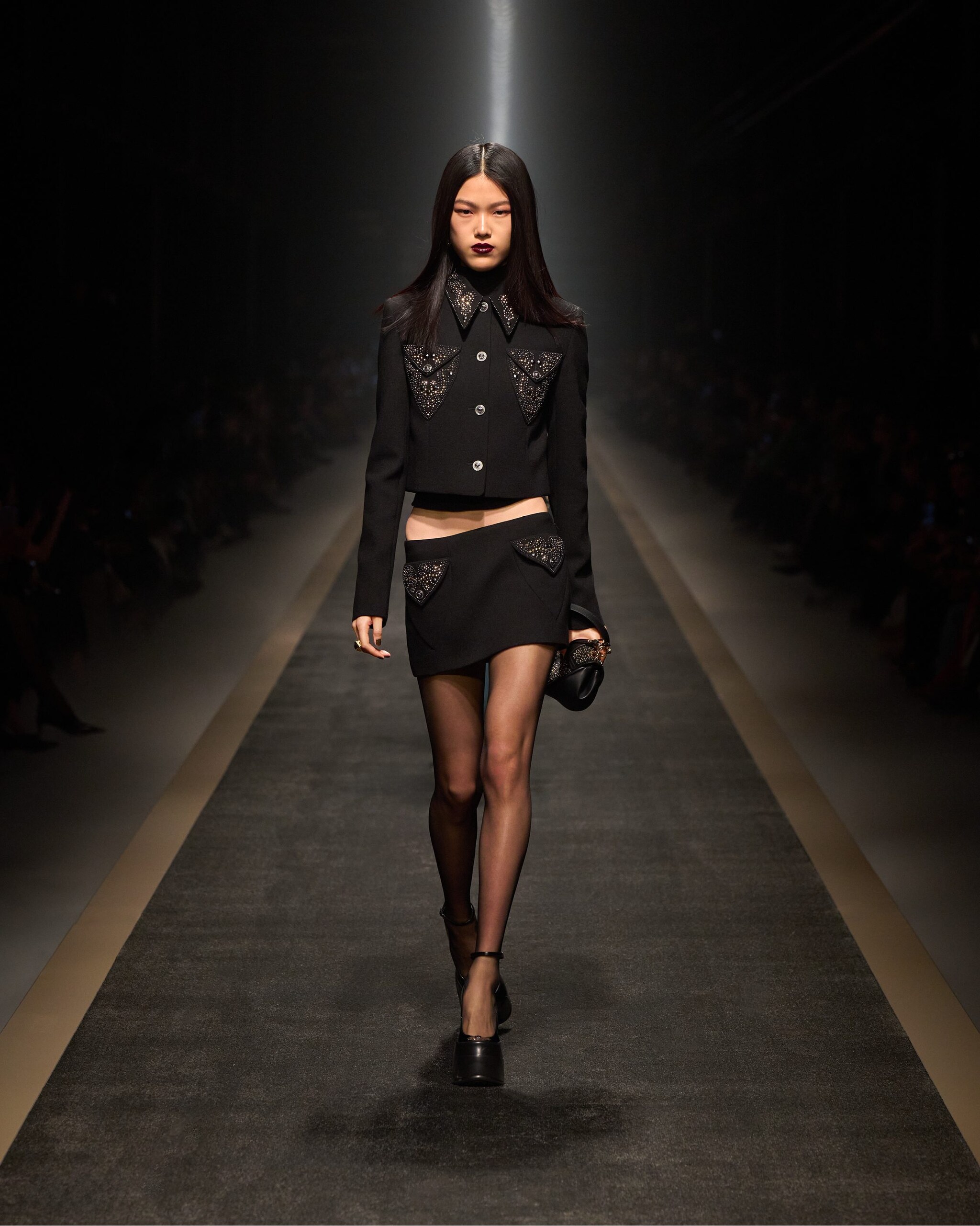 Abiti con gonne trapunta dalle iconiche stampe, mini dress che sembrano realizzati con lembi di tessuto e gonne a ruota dalle linee sinuose sfilano alla Milano Fashion Week sulla passerella Autunno/Inverno 2025-2026 di Versace