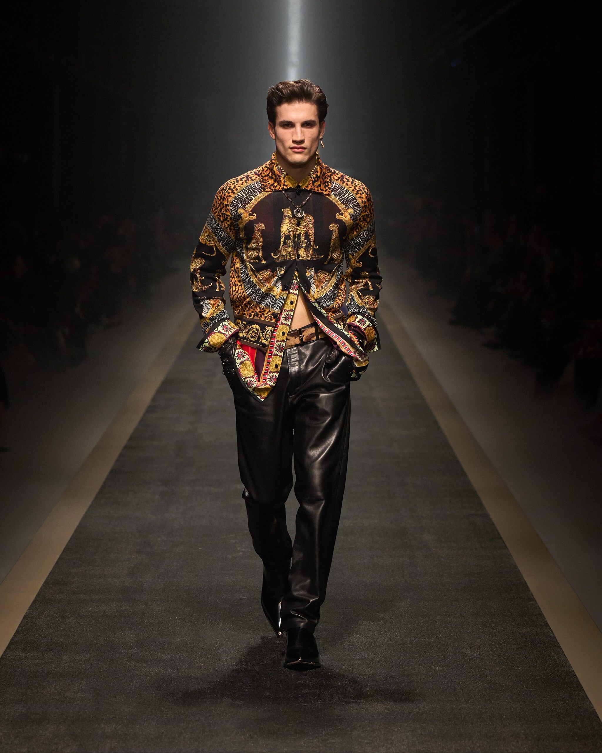 Abiti con gonne trapunta dalle iconiche stampe, mini dress che sembrano realizzati con lembi di tessuto e gonne a ruota dalle linee sinuose sfilano alla Milano Fashion Week sulla passerella Autunno/Inverno 2025-2026 di Versace