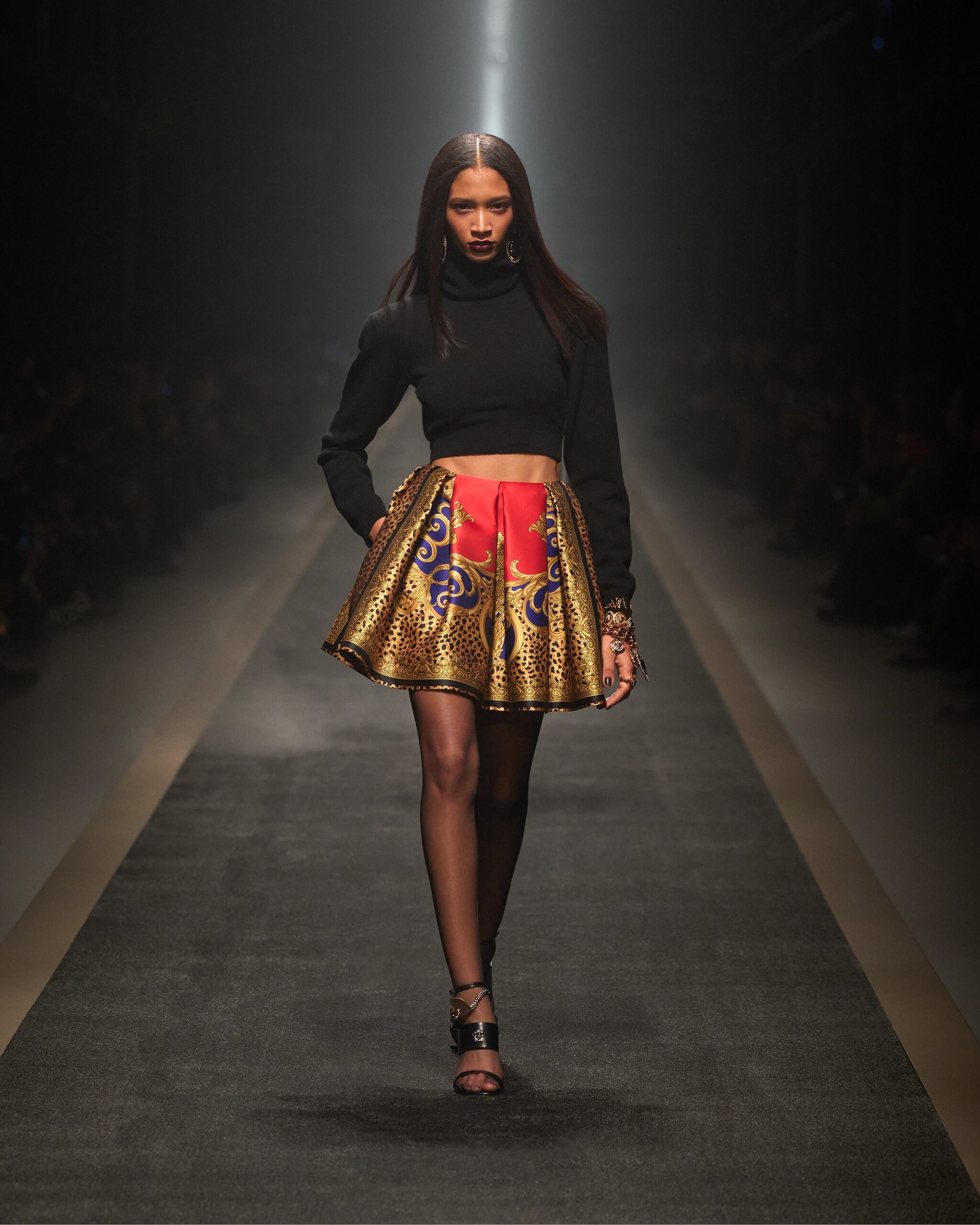 Abiti con gonne trapunta dalle iconiche stampe, mini dress che sembrano realizzati con lembi di tessuto e gonne a ruota dalle linee sinuose sfilano alla Milano Fashion Week sulla passerella Autunno/Inverno 2025-2026 di Versace