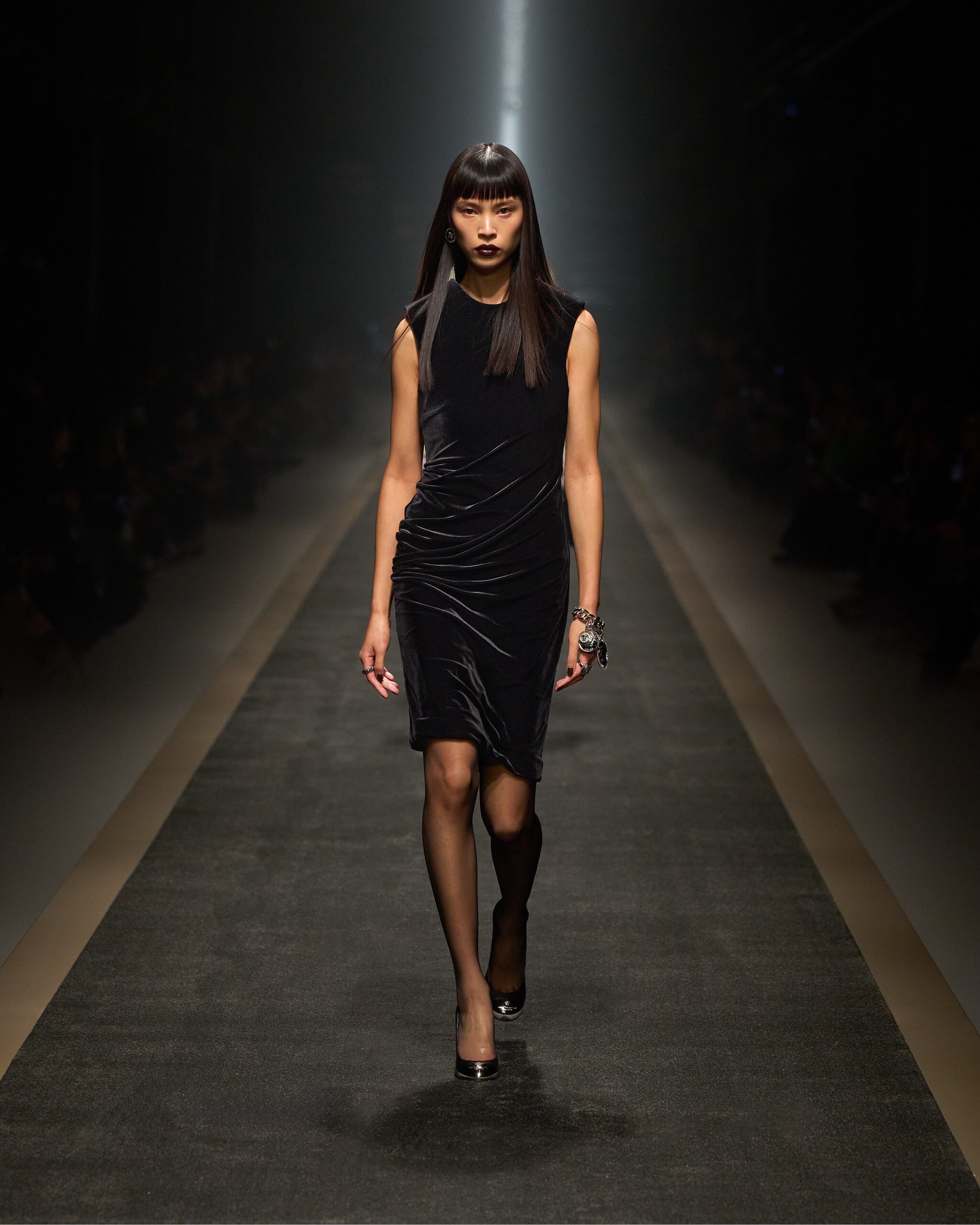 Abiti con gonne trapunta dalle iconiche stampe, mini dress che sembrano realizzati con lembi di tessuto e gonne a ruota dalle linee sinuose sfilano alla Milano Fashion Week sulla passerella Autunno/Inverno 2025-2026 di Versace