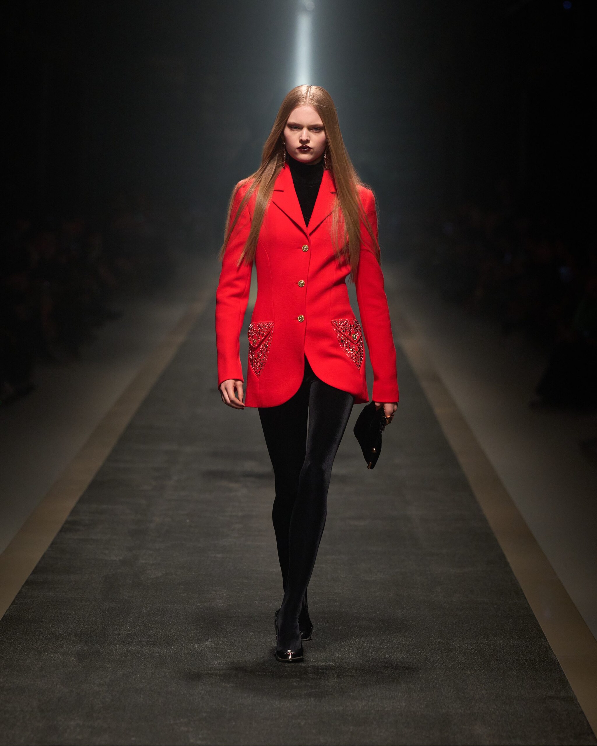 Abiti con gonne trapunta dalle iconiche stampe, mini dress che sembrano realizzati con lembi di tessuto e gonne a ruota dalle linee sinuose sfilano alla Milano Fashion Week sulla passerella Autunno/Inverno 2025-2026 di Versace