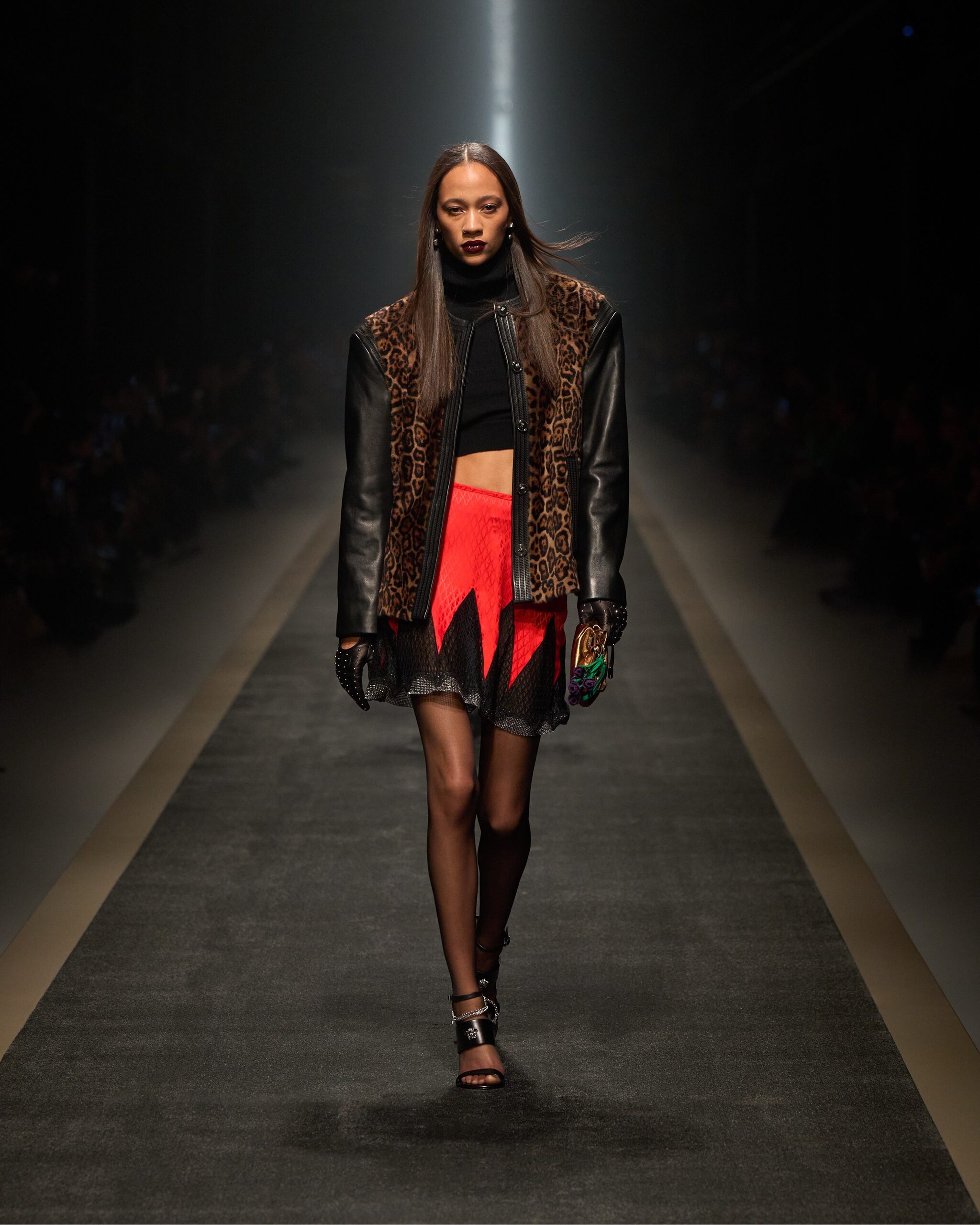 Abiti con gonne trapunta dalle iconiche stampe, mini dress che sembrano realizzati con lembi di tessuto e gonne a ruota dalle linee sinuose sfilano alla Milano Fashion Week sulla passerella Autunno/Inverno 2025-2026 di Versace