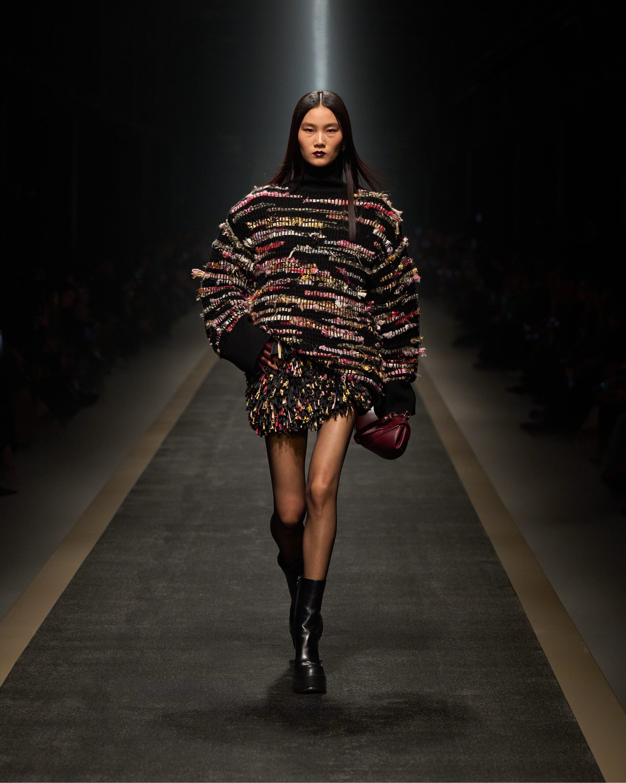 Abiti con gonne trapunta dalle iconiche stampe, mini dress che sembrano realizzati con lembi di tessuto e gonne a ruota dalle linee sinuose sfilano alla Milano Fashion Week sulla passerella Autunno/Inverno 2025-2026 di Versace