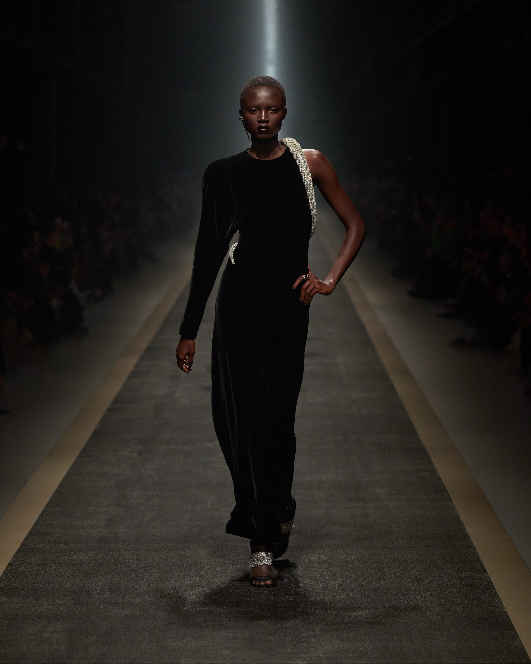 Abiti con gonne trapunta dalle iconiche stampe, mini dress che sembrano realizzati con lembi di tessuto e gonne a ruota dalle linee sinuose sfilano alla Milano Fashion Week sulla passerella Autunno/Inverno 2025-2026 di Versace