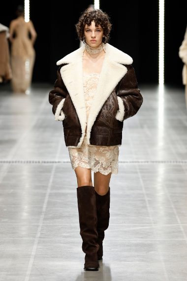 Corsetti e top ispirati al mondo della lingerie, grossi cardigan in lana, abiti impalpabili in seta trasparente o in pizzo floreale sfilano alla Milano Fashion Week sulla passerella Autunno/Inverno 2025-2026 di Ermanno Scervino