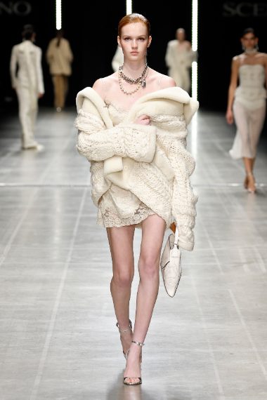 Corsetti e top ispirati al mondo della lingerie, grossi cardigan in lana, abiti impalpabili in seta trasparente o in pizzo floreale sfilano alla Milano Fashion Week sulla passerella Autunno/Inverno 2025-2026 di Ermanno Scervino