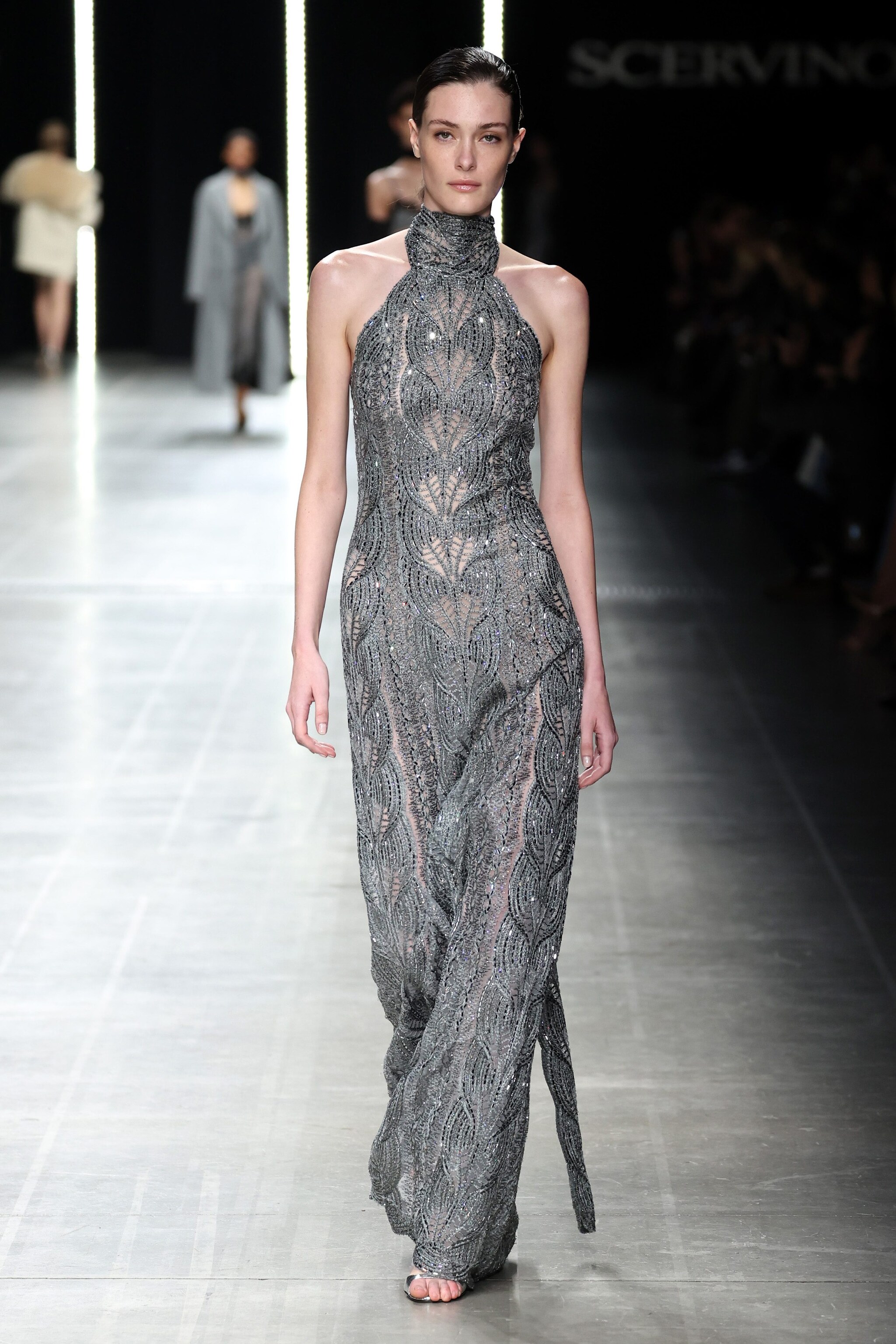 Corsetti e top ispirati al mondo della lingerie, grossi cardigan in lana, abiti impalpabili in seta trasparente o in pizzo floreale sfilano alla Milano Fashion Week sulla passerella Autunno/Inverno 2025-2026 di Ermanno Scervino