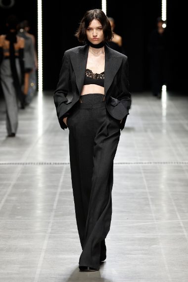 Corsetti e top ispirati al mondo della lingerie, grossi cardigan in lana, abiti impalpabili in seta trasparente o in pizzo floreale sfilano alla Milano Fashion Week sulla passerella Autunno/Inverno 2025-2026 di Ermanno Scervino