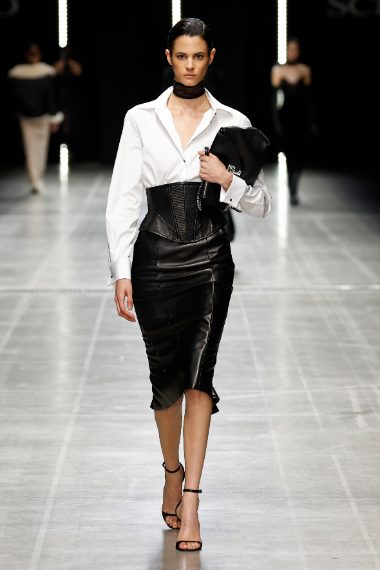 Corsetti e top ispirati al mondo della lingerie, grossi cardigan in lana, abiti impalpabili in seta trasparente o in pizzo floreale sfilano alla Milano Fashion Week sulla passerella Autunno/Inverno 2025-2026 di Ermanno Scervino