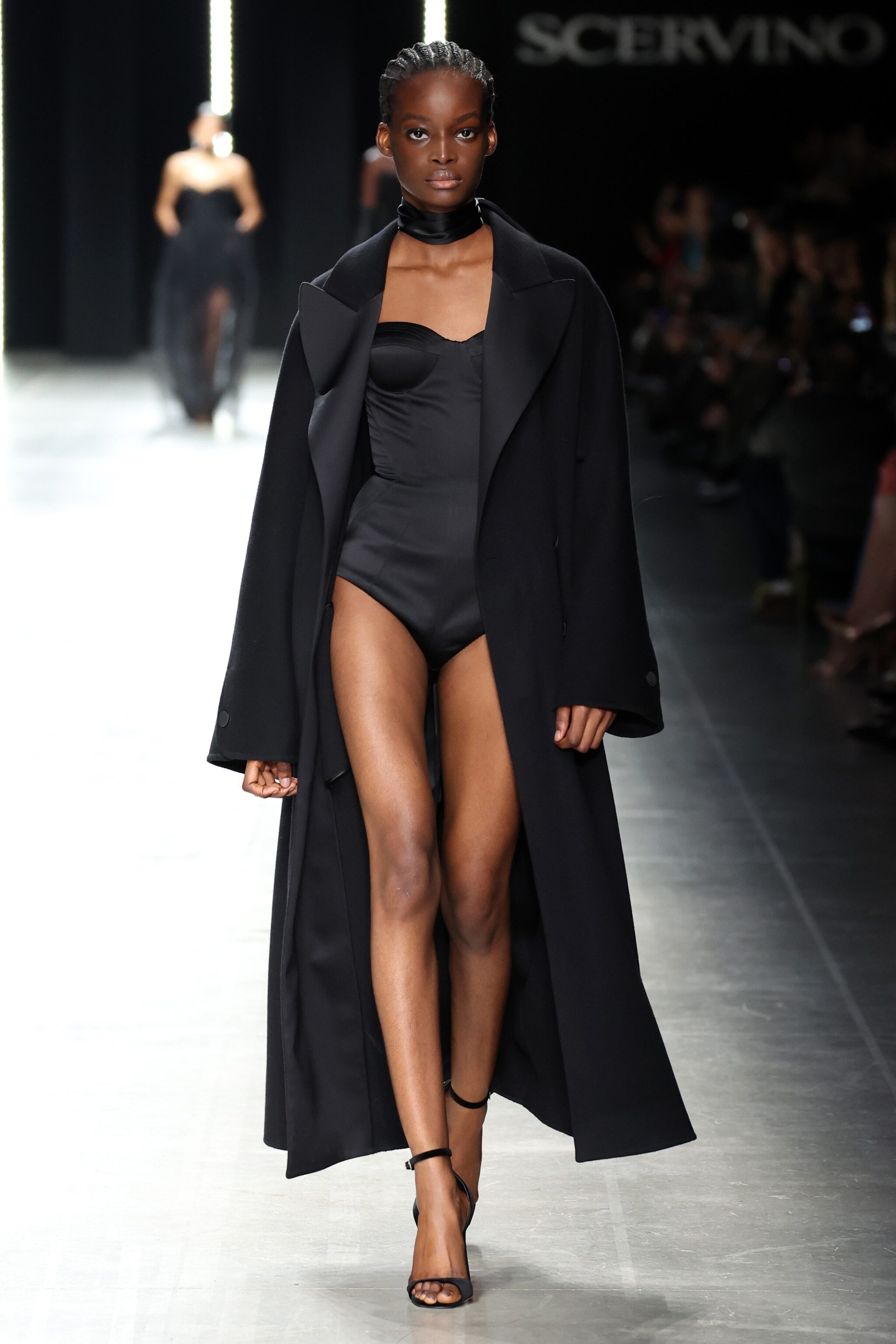 Corsetti e top ispirati al mondo della lingerie, grossi cardigan in lana, abiti impalpabili in seta trasparente o in pizzo floreale sfilano alla Milano Fashion Week sulla passerella Autunno/Inverno 2025-2026 di Ermanno Scervino