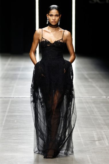 Corsetti e top ispirati al mondo della lingerie, grossi cardigan in lana, abiti impalpabili in seta trasparente o in pizzo floreale sfilano alla Milano Fashion Week sulla passerella Autunno/Inverno 2025-2026 di Ermanno Scervino