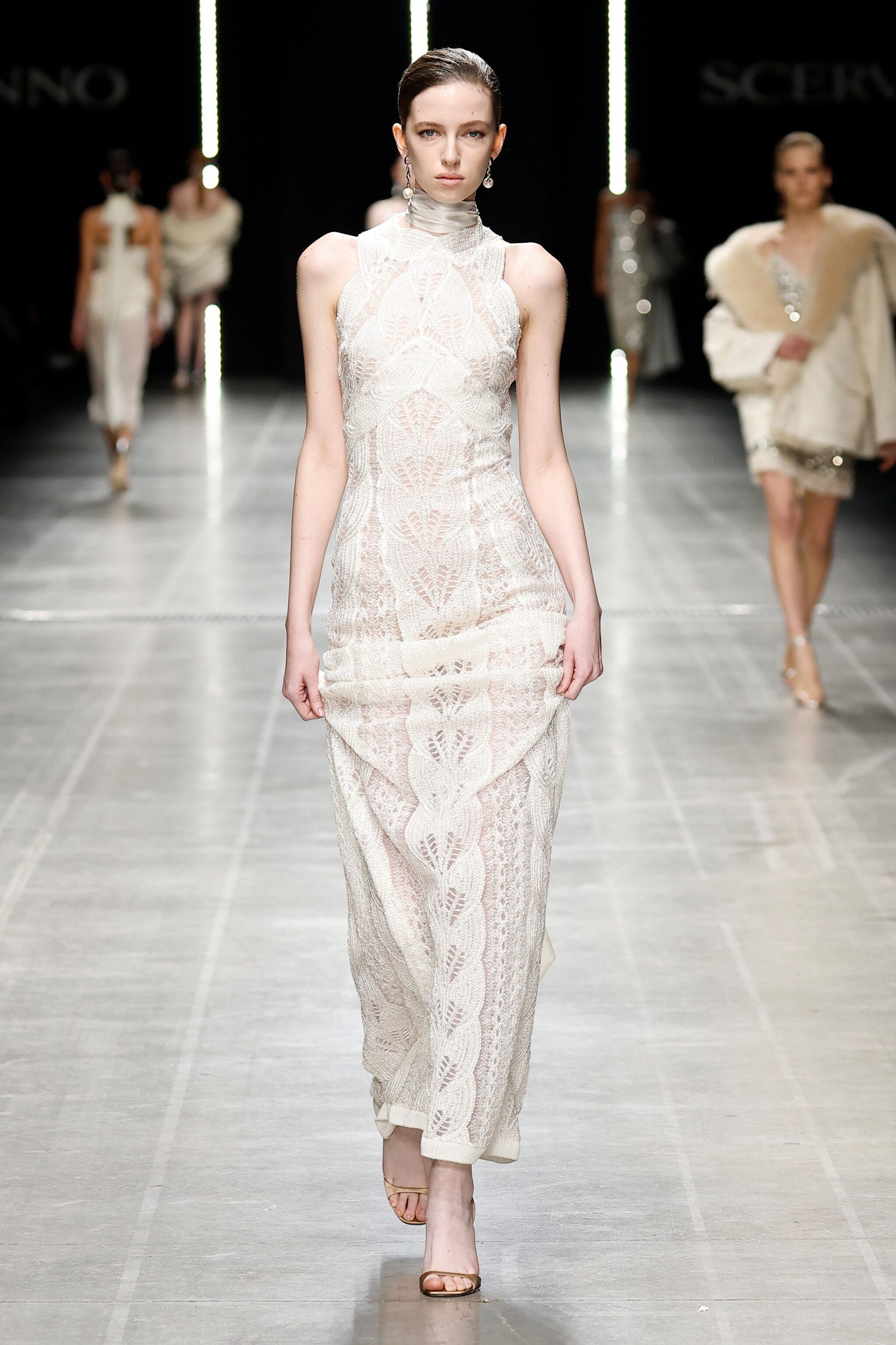 Corsetti e top ispirati al mondo della lingerie, grossi cardigan in lana, abiti impalpabili in seta trasparente o in pizzo floreale sfilano alla Milano Fashion Week sulla passerella Autunno/Inverno 2025-2026 di Ermanno Scervino