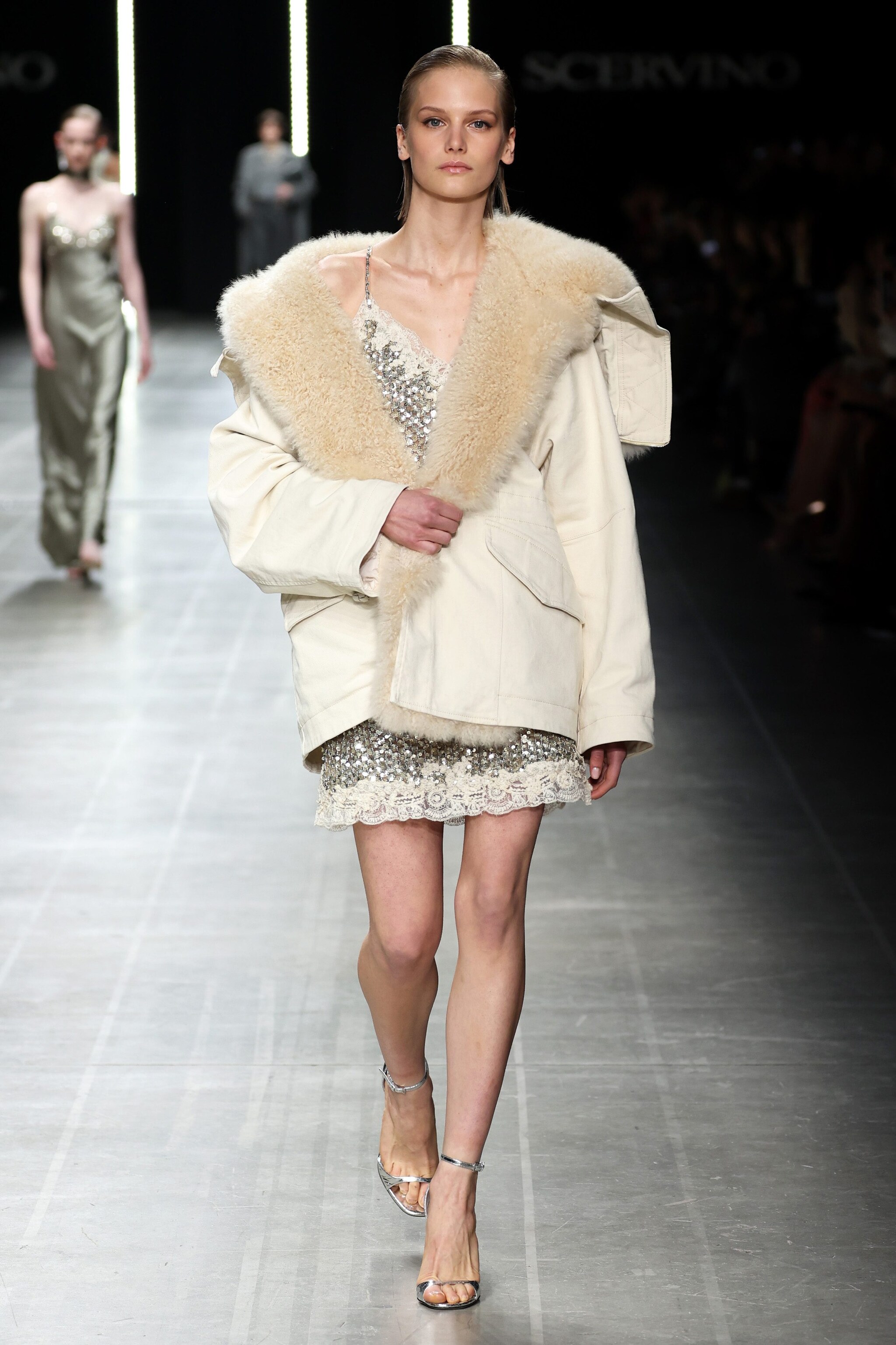 Corsetti e top ispirati al mondo della lingerie, grossi cardigan in lana, abiti impalpabili in seta trasparente o in pizzo floreale sfilano alla Milano Fashion Week sulla passerella Autunno/Inverno 2025-2026 di Ermanno Scervino