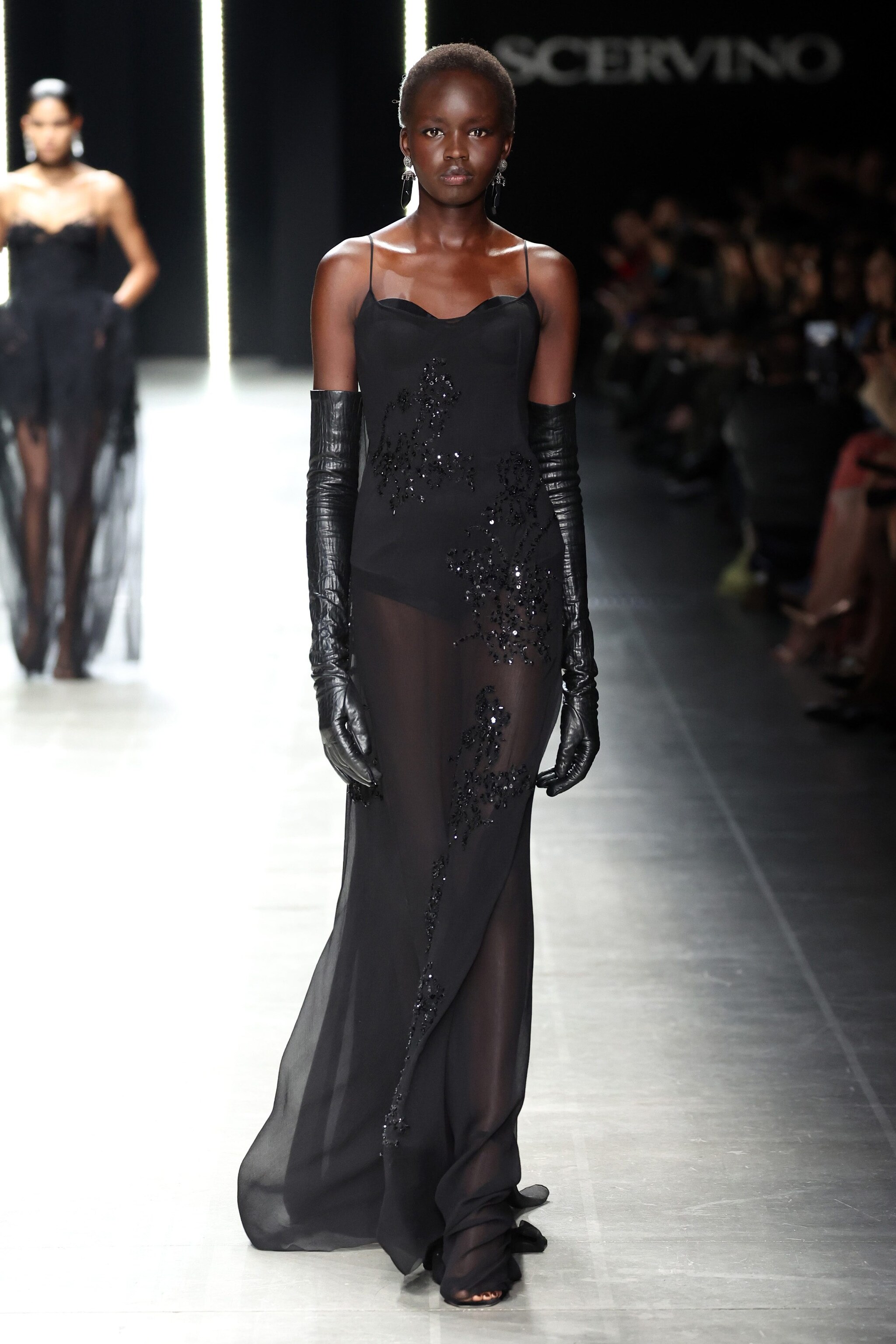 Corsetti e top ispirati al mondo della lingerie, grossi cardigan in lana, abiti impalpabili in seta trasparente o in pizzo floreale sfilano alla Milano Fashion Week sulla passerella Autunno/Inverno 2025-2026 di Ermanno Scervino