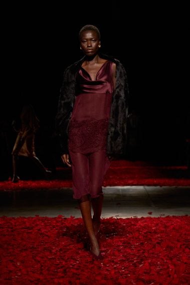 Look monocolore si alternano a tubini in maglia maxi pellicce e abiti ricoperti di fiori pendenti e tridimensionali sulla passerella Autunno/Inverno 2025-2026 di Ferragamo