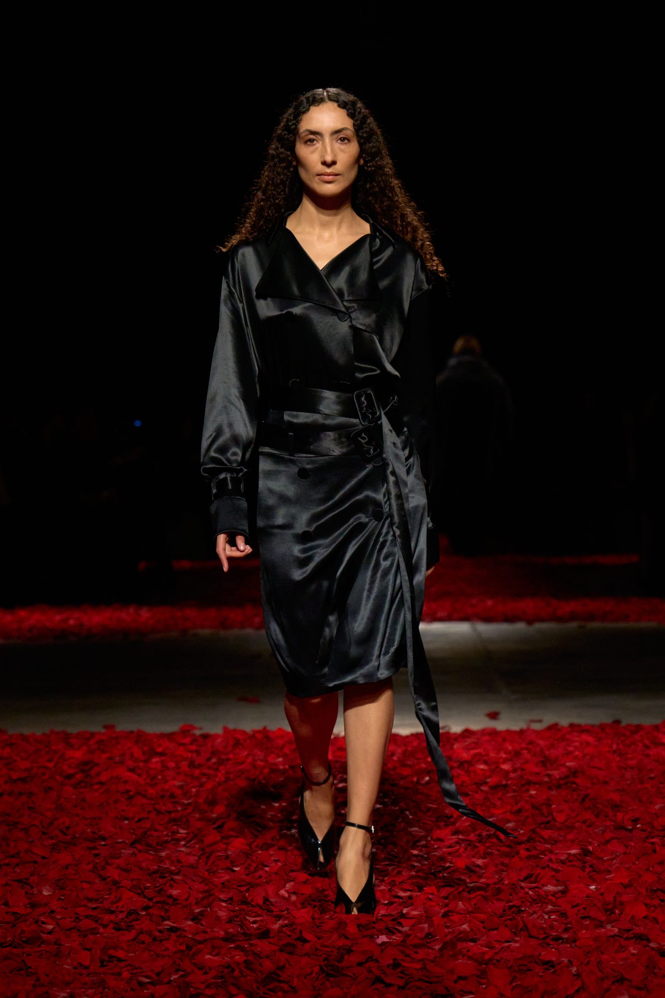 Look monocolore si alternano a tubini in maglia maxi pellicce e abiti ricoperti di fiori pendenti e tridimensionali sulla passerella Autunno/Inverno 2025-2026 di Ferragamo