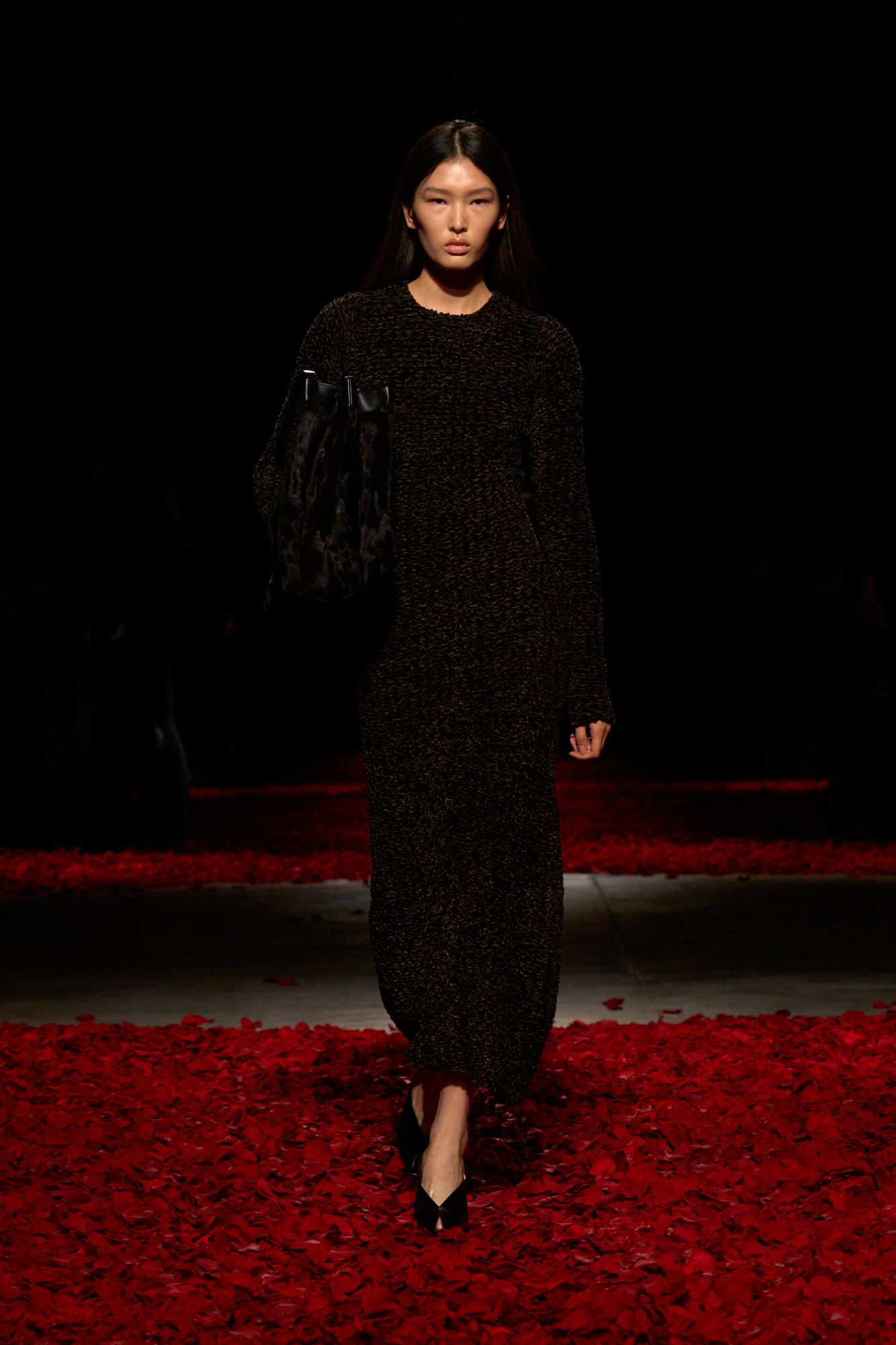 Look monocolore si alternano a tubini in maglia maxi pellicce e abiti ricoperti di fiori pendenti e tridimensionali sulla passerella Autunno/Inverno 2025-2026 di Ferragamo
