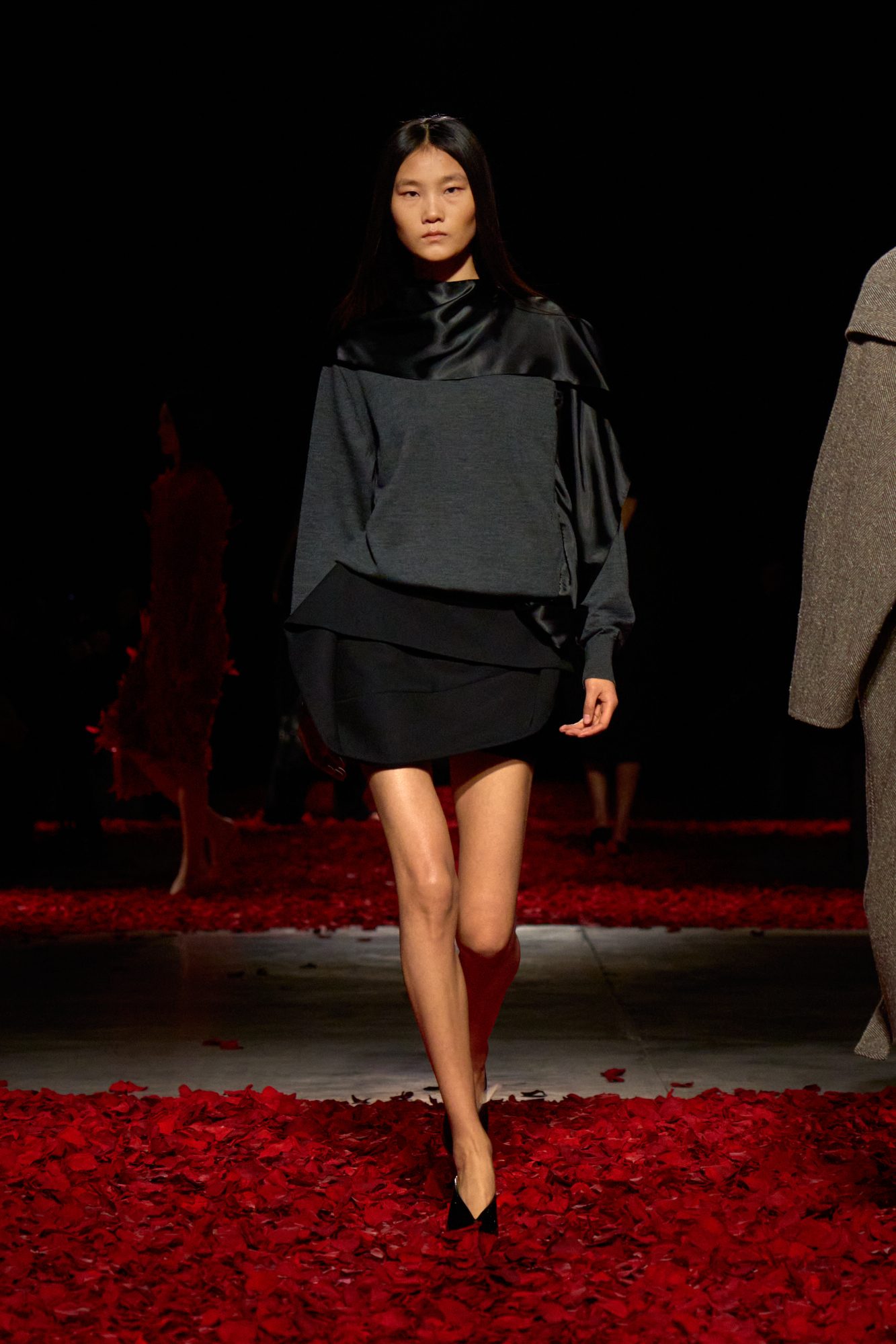 Look monocolore si alternano a tubini in maglia maxi pellicce e abiti ricoperti di fiori pendenti e tridimensionali sulla passerella Autunno/Inverno 2025-2026 di Ferragamo