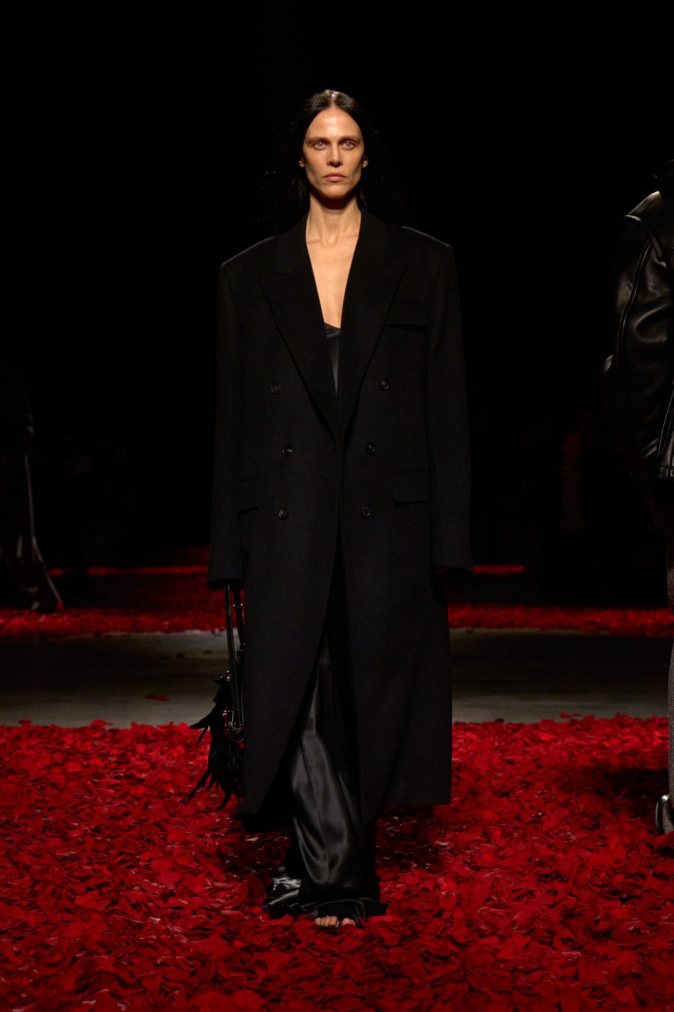 Look monocolore si alternano a tubini in maglia maxi pellicce e abiti ricoperti di fiori pendenti e tridimensionali sulla passerella Autunno/Inverno 2025-2026 di Ferragamo