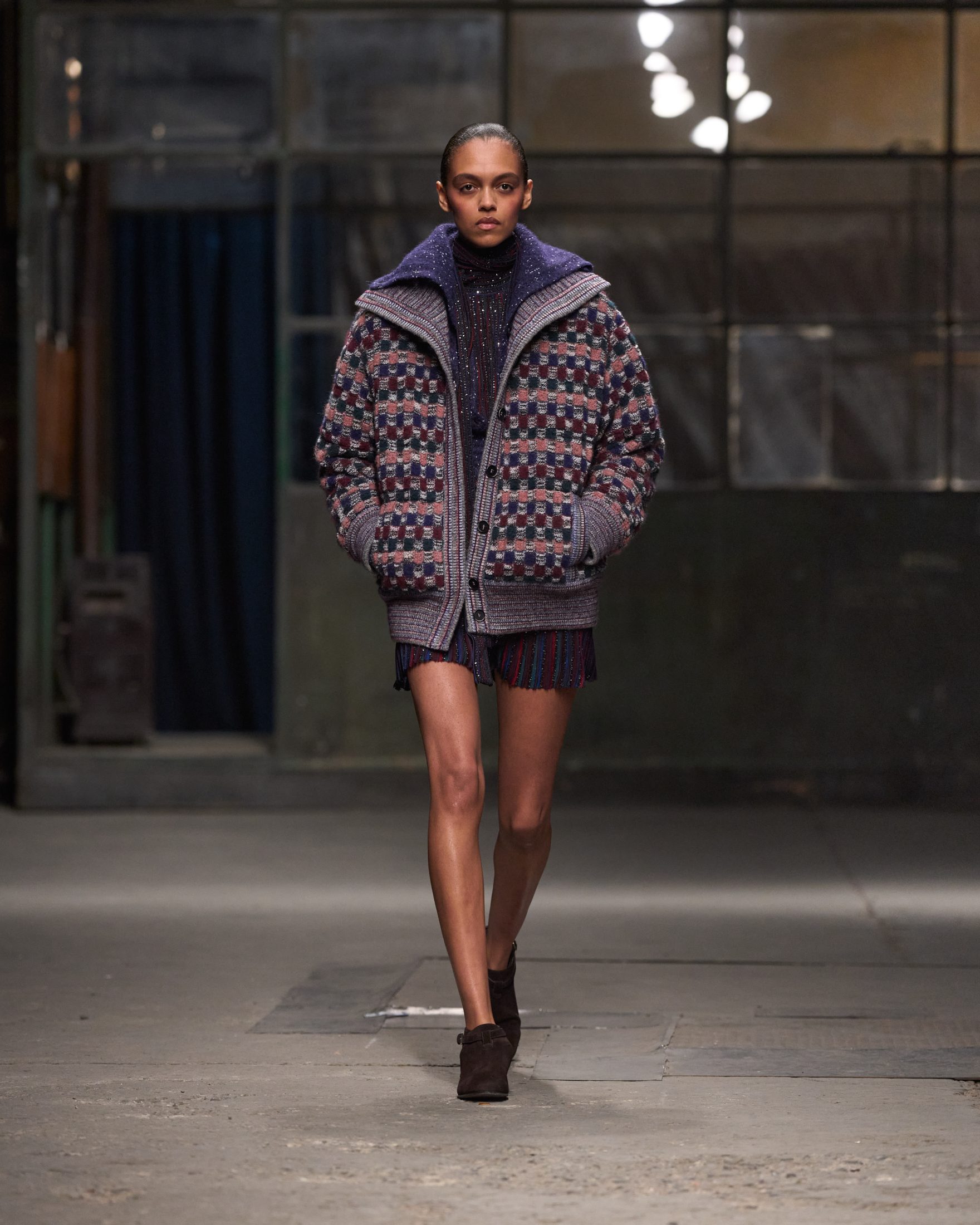 Colori scuri e neturi, fantasie a quadri mescolate con quelle a righe e layering di capi a contrasto sfilano Milano Fashion Week sulla Autunno/Inverno 2025-2026 di Missoni
