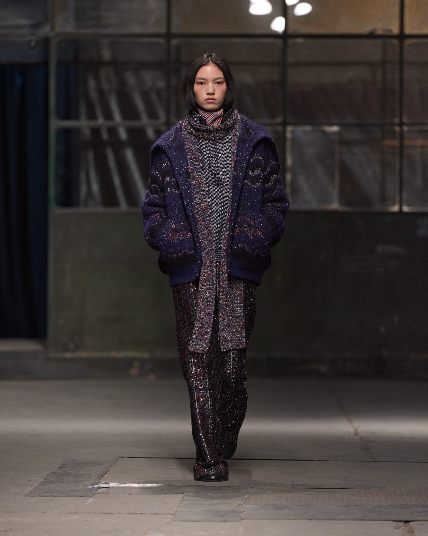 Colori scuri e neturi, fantasie a quadri mescolate con quelle a righe e layering di capi a contrasto sfilano Milano Fashion Week sulla Autunno/Inverno 2025-2026 di Missoni