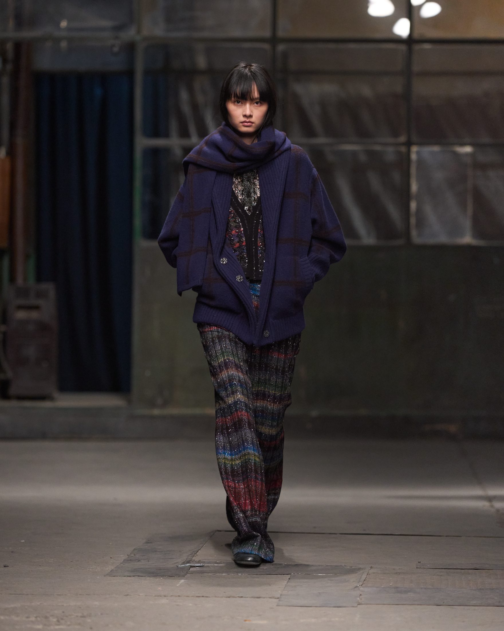 Colori scuri e neturi, fantasie a quadri mescolate con quelle a righe e layering di capi a contrasto sfilano Milano Fashion Week sulla Autunno/Inverno 2025-2026 di Missoni
