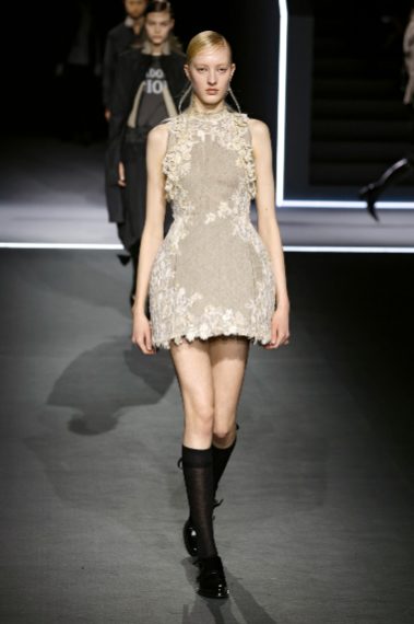Ruche, pizzo color crema, abiti clessidra e ricami floreali sfilano alla Paris Fashion Week sulla passerella Autunno/Inverno 2025-2026 di Dior