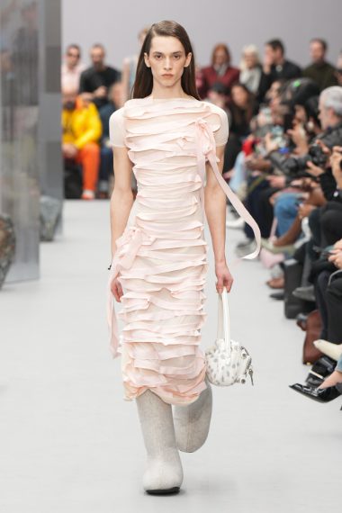 Body in lana, maxi pellicce, blazer dalla spalline balloon, fiocchi e denim stropicciato sfilano alla Paris Fashion Week sulla passerella Autunno/Inverno 2025-2026 di Acne Studios