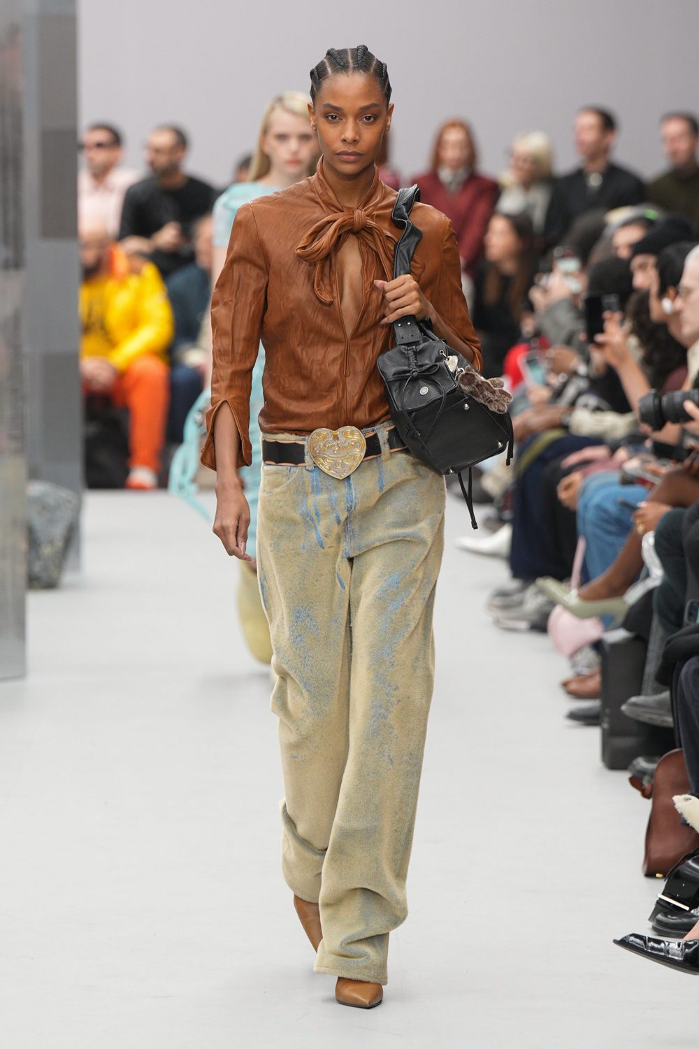 Body in lana, maxi pellicce, blazer dalla spalline balloon, fiocchi e denim stropicciato sfilano alla Paris Fashion Week sulla passerella Autunno/Inverno 2025-2026 di Acne Studios