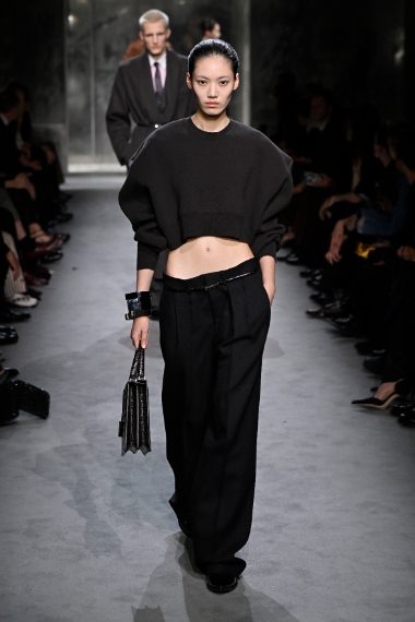 Look in pelle nera o total white, abiti tunica dai tessuti morbidi e lucenti, linee essenziali e tagli sartoriali sfilano alla Paris Fashion Week sulla passerella Autunno/Inverno 2025-2026 nella collezione disegnata da Haider Ackermann per Tom Ford