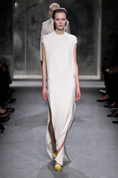 Look in pelle nera o total white, abiti tunica dai tessuti morbidi e lucenti, linee essenziali e tagli sartoriali sfilano alla Paris Fashion Week sulla passerella Autunno/Inverno 2025-2026 nella collezione disegnata da Haider Ackermann per Tom Ford