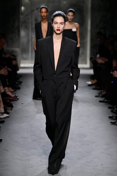 Look in pelle nera o total white, abiti tunica dai tessuti morbidi e lucenti, linee essenziali e tagli sartoriali sfilano alla Paris Fashion Week sulla passerella Autunno/Inverno 2025-2026 nella collezione disegnata da Haider Ackermann per Tom Ford