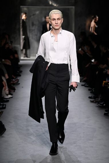 Look in pelle nera o total white, abiti tunica dai tessuti morbidi e lucenti, linee essenziali e tagli sartoriali sfilano alla Paris Fashion Week sulla passerella Autunno/Inverno 2025-2026 nella collezione disegnata da Haider Ackermann per Tom Ford