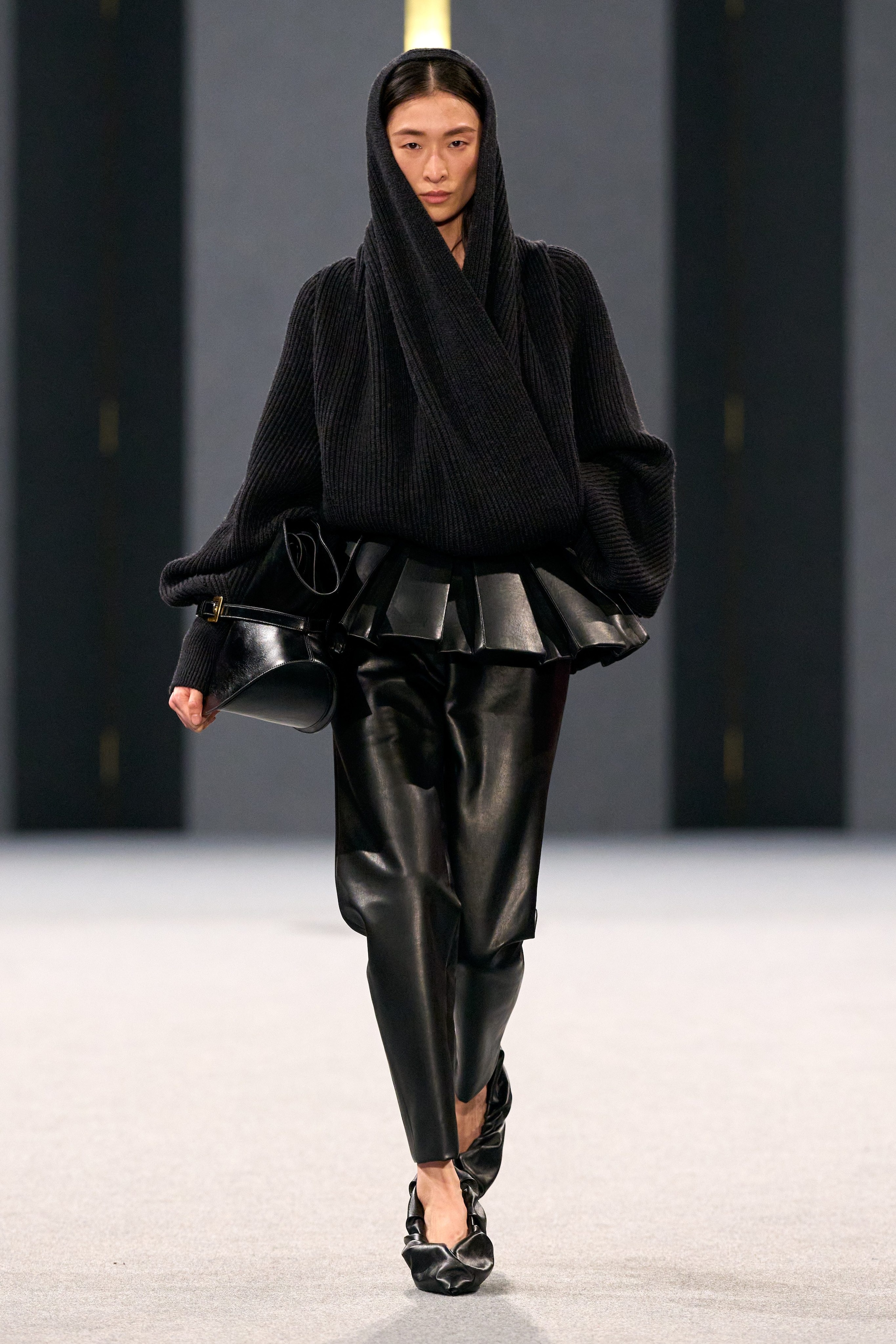 Cappotti dai rever giganti, stivali in pelle drappeggiat, abiti con baschine e maglioni dalle tonalità luminose sfilano alla Paris Fashion Week sulla passerella Autunno/Inverno 2025-2026 di Balmain.