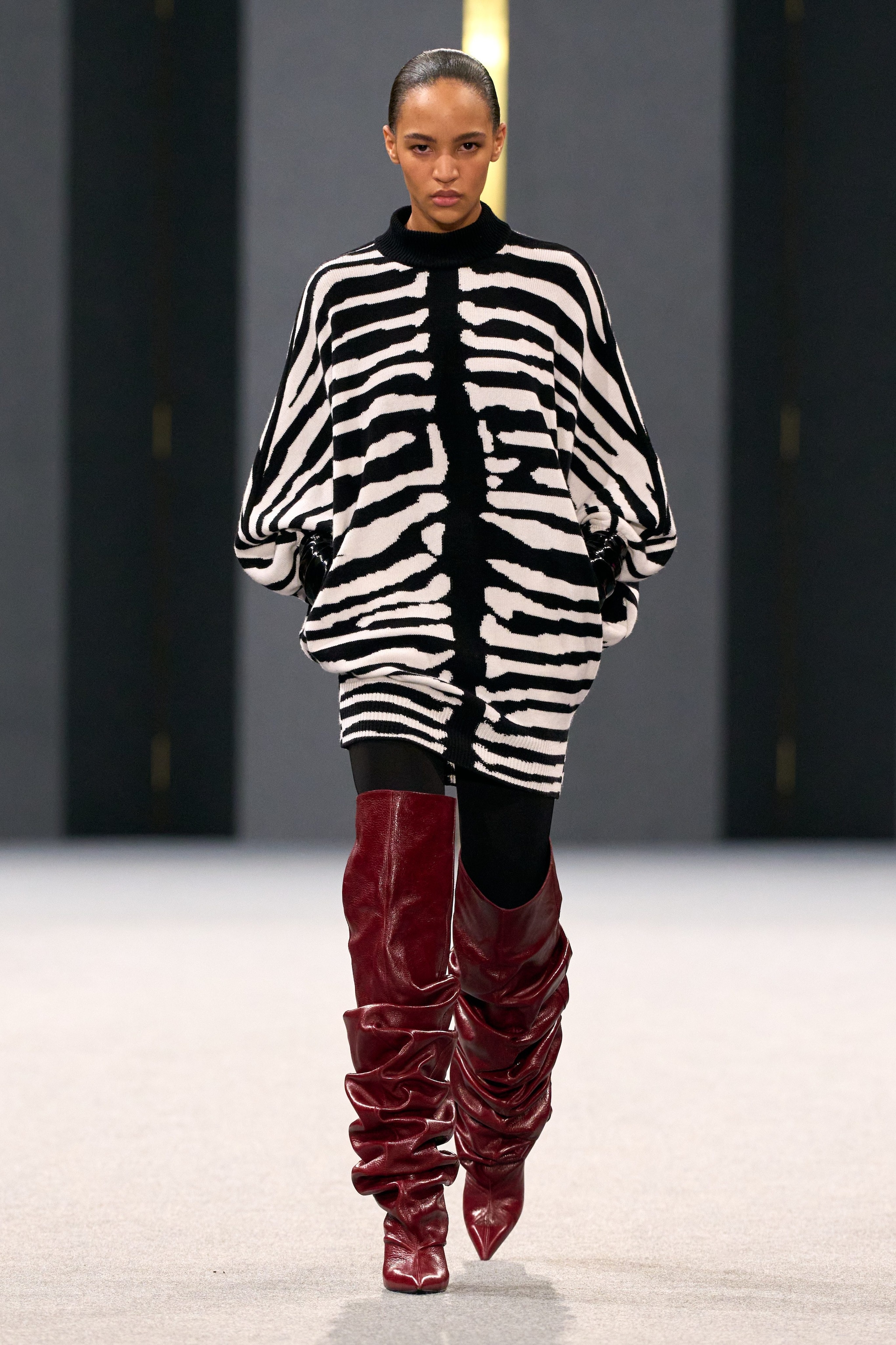 Cappotti dai rever giganti, stivali in pelle drappeggiat, abiti con baschine e maglioni dalle tonalità luminose sfilano alla Paris Fashion Week sulla passerella Autunno/Inverno 2025-2026 di Balmain.