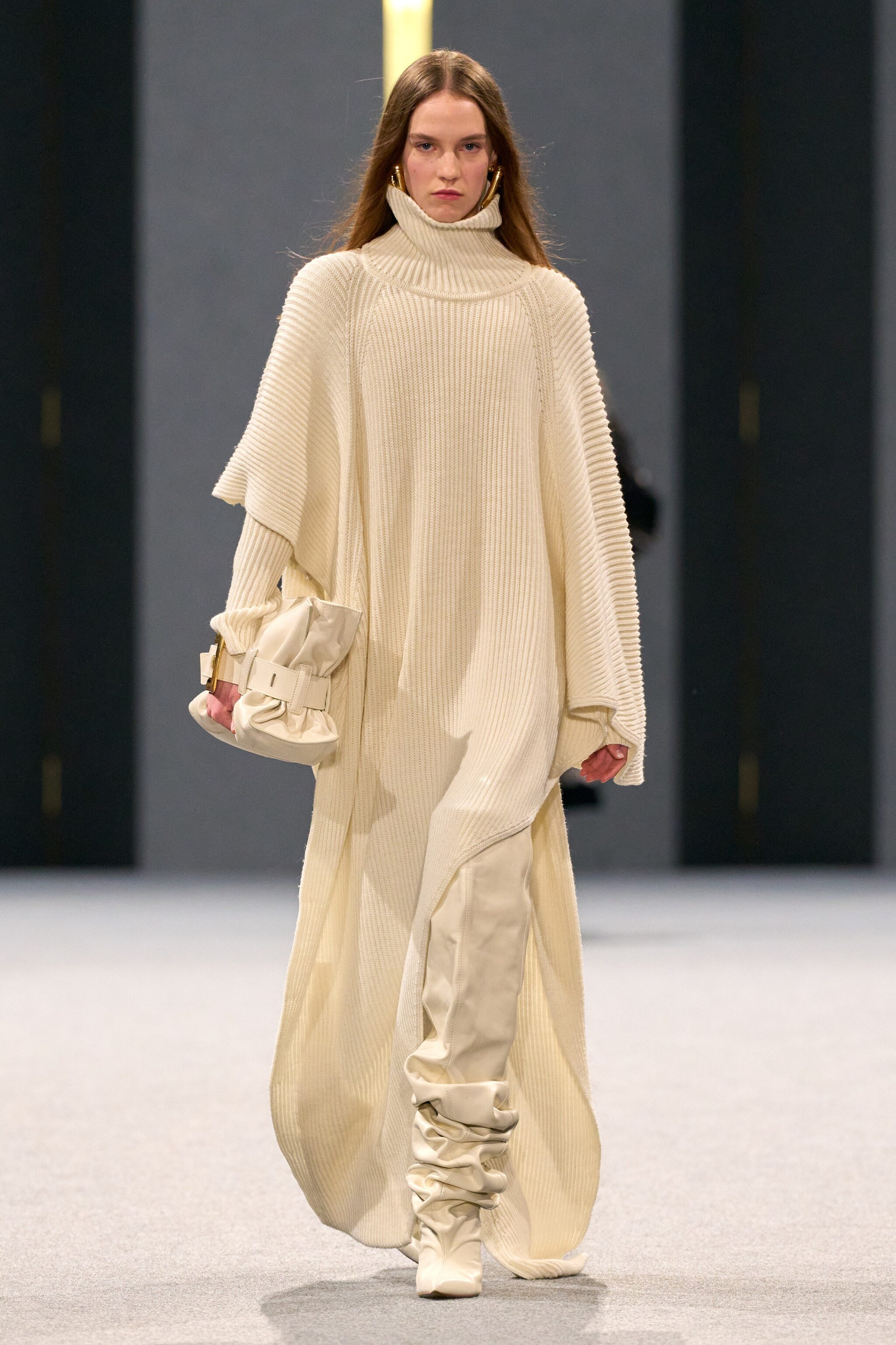 Cappotti dai rever giganti, stivali in pelle drappeggiat, abiti con baschine e maglioni dalle tonalità luminose sfilano alla Paris Fashion Week sulla passerella Autunno/Inverno 2025-2026 di Balmain.