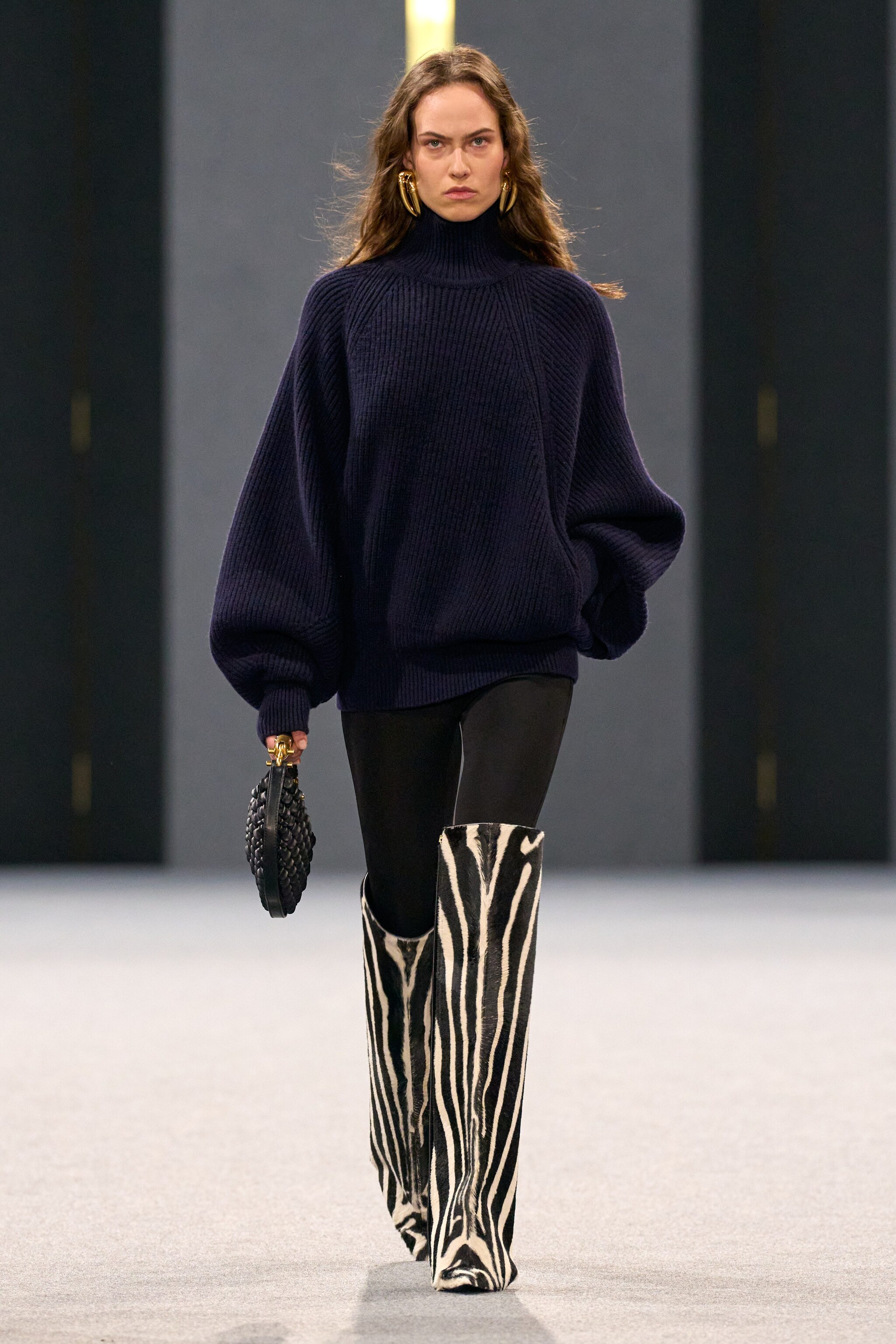 Cappotti dai rever giganti, stivali in pelle drappeggiat, abiti con baschine e maglioni dalle tonalità luminose sfilano alla Paris Fashion Week sulla passerella Autunno/Inverno 2025-2026 di Balmain.