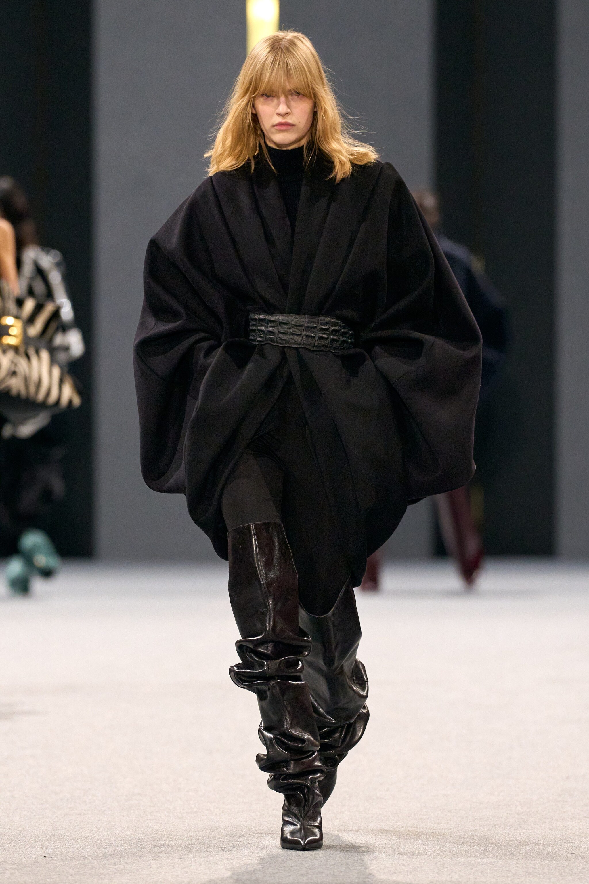Cappotti dai rever giganti, stivali in pelle drappeggiat, abiti con baschine e maglioni dalle tonalità luminose sfilano alla Paris Fashion Week sulla passerella Autunno/Inverno 2025-2026 di Balmain.