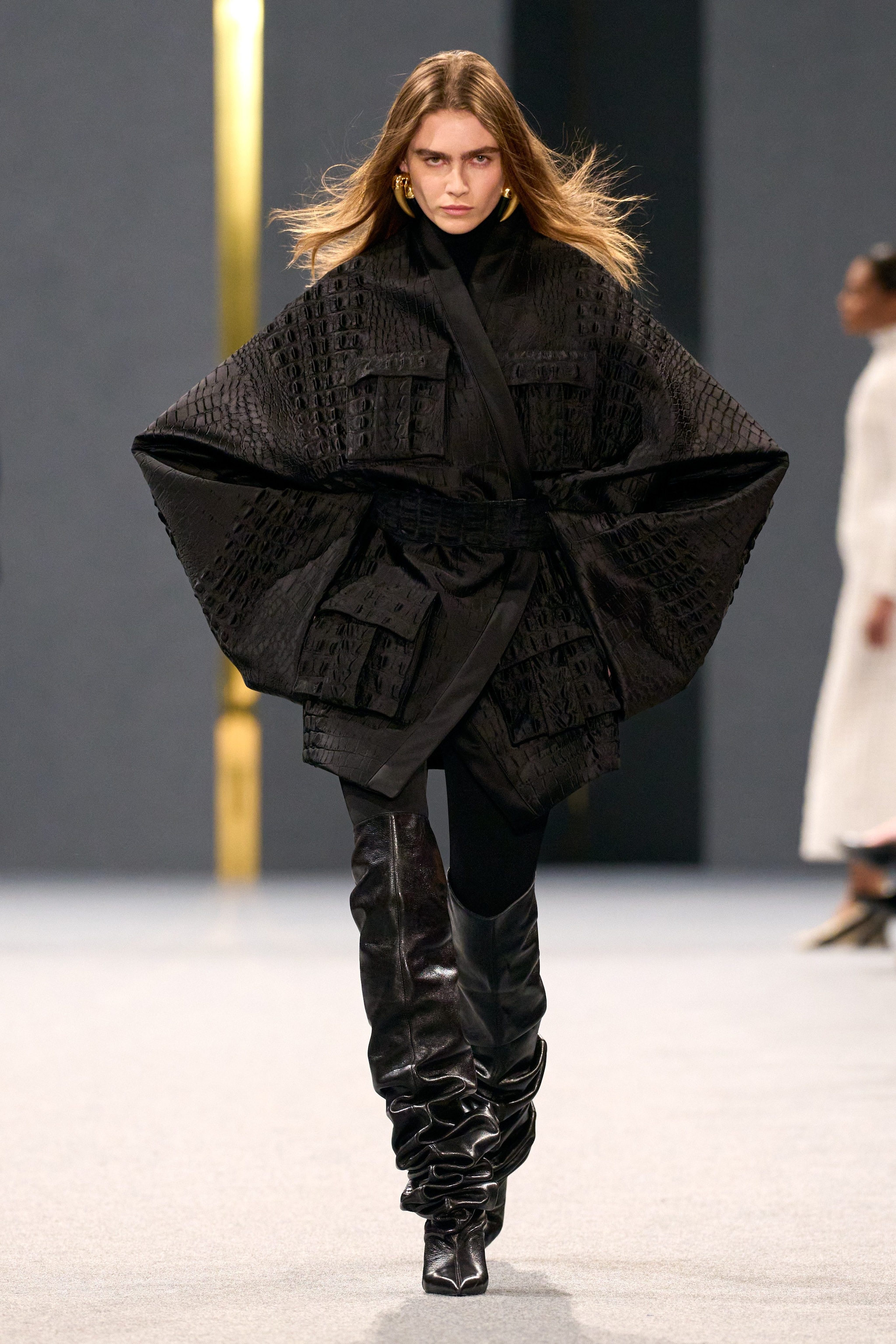 Cappotti dai rever giganti, stivali in pelle drappeggiat, abiti con baschine e maglioni dalle tonalità luminose sfilano alla Paris Fashion Week sulla passerella Autunno/Inverno 2025-2026 di Balmain.