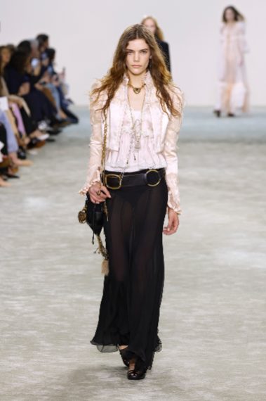 Abiti in seta e modelli in pizzo, dettagli in pelliccia, ruche e volant sfilano alla Paris Fashion Week sulla passerella Autunno/Inverno 2025-2026 di Chloé