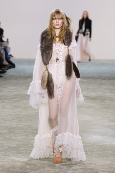 Abiti in seta e modelli in pizzo, dettagli in pelliccia, ruche e volant sfilano alla Paris Fashion Week sulla passerella Autunno/Inverno 2025-2026 di Chloé