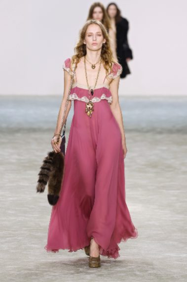Abiti in seta e modelli in pizzo, dettagli in pelliccia, ruche e volant sfilano alla Paris Fashion Week sulla passerella Autunno/Inverno 2025-2026 di Chloé