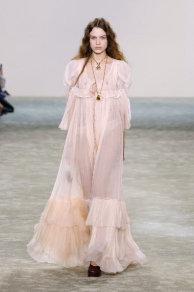 Abiti in seta e modelli in pizzo, dettagli in pelliccia, ruche e volant sfilano alla Paris Fashion Week sulla passerella Autunno/Inverno 2025-2026 di Chloé