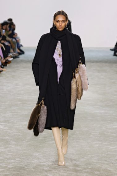 Abiti in seta e modelli in pizzo, dettagli in pelliccia, ruche e volant sfilano alla Paris Fashion Week sulla passerella Autunno/Inverno 2025-2026 di Chloé