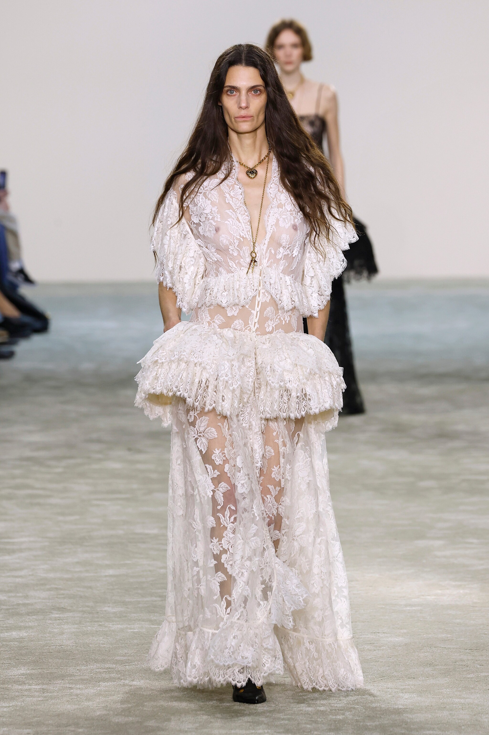 Abiti in seta e modelli in pizzo, dettagli in pelliccia, ruche e volant sfilano alla Paris Fashion Week sulla passerella Autunno/Inverno 2025-2026 di Chloé