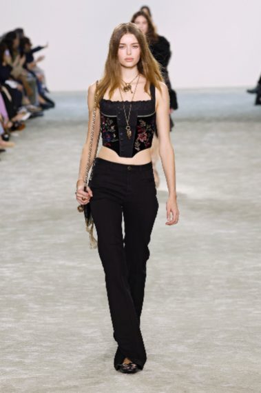 Abiti in seta e modelli in pizzo, dettagli in pelliccia, ruche e volant sfilano alla Paris Fashion Week sulla passerella Autunno/Inverno 2025-2026 di Chloé