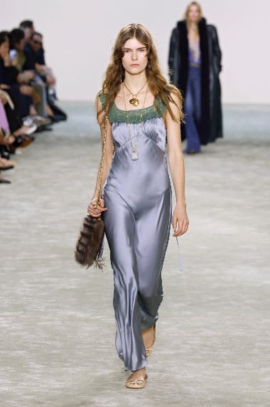 Abiti in seta e modelli in pizzo, dettagli in pelliccia, ruche e volant sfilano alla Paris Fashion Week sulla passerella Autunno/Inverno 2025-2026 di Chloé